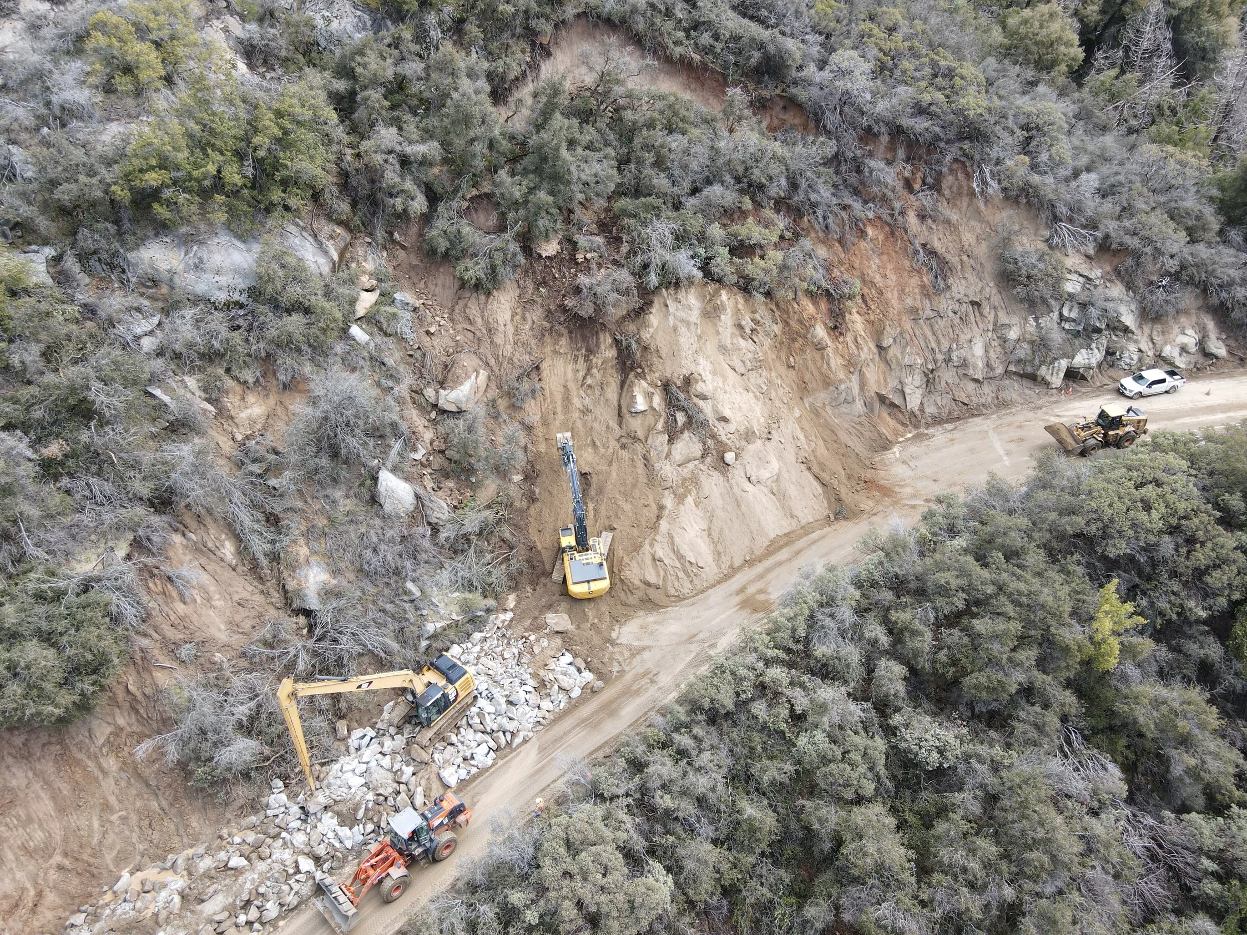 Cal Valley Construction’s emergency landslide cleanup after the record 2022‑23 winter storms—excavators hammering boulders, a wheel loader clearing rubble, and crews rebuilding a washed‑out mountain road under a state‑agency contract.