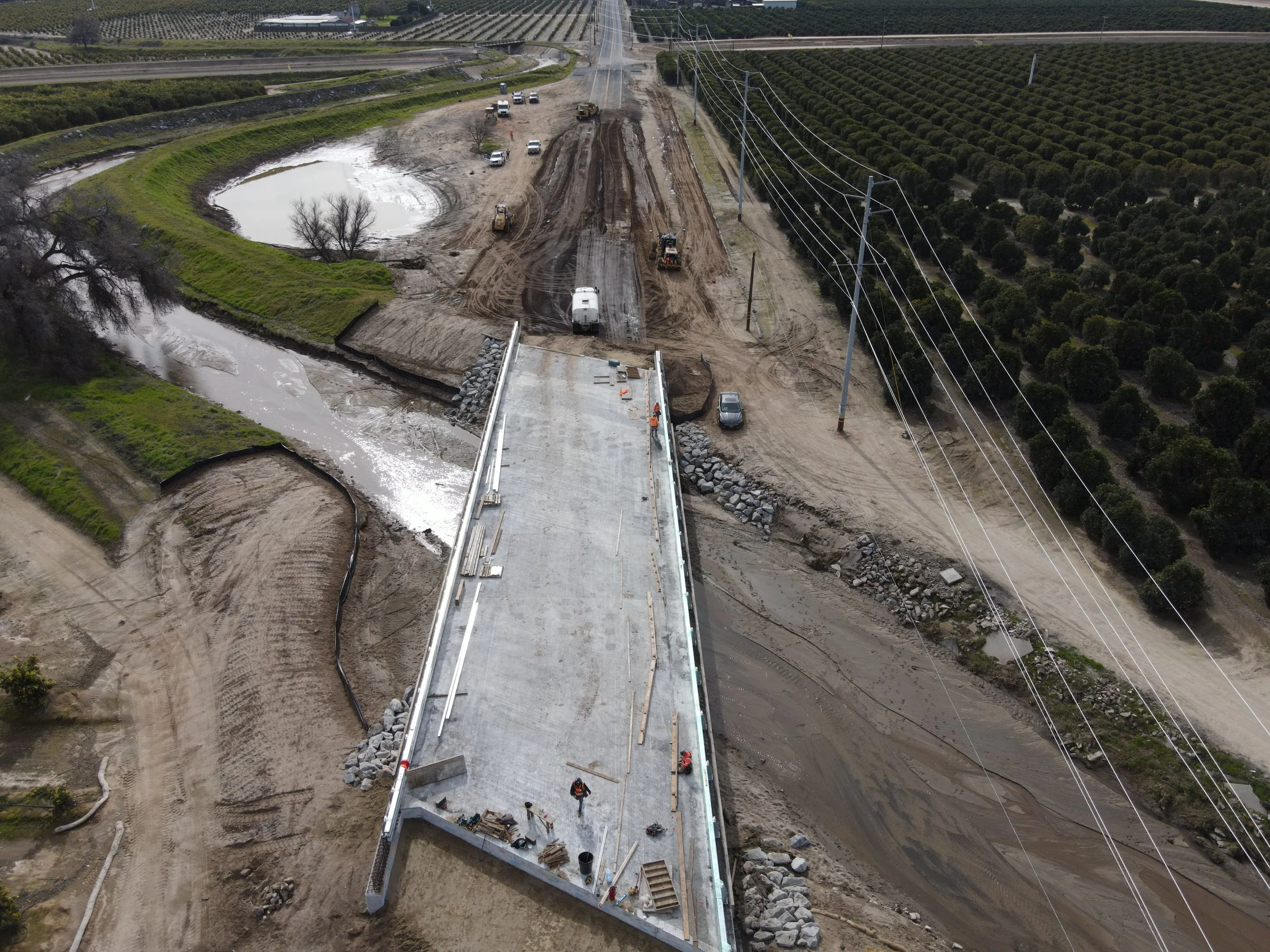 Cal Valley Construction replacing a rural municipal bridge—old span removed, new concrete deck taking shape over an irrigation channel, flanked by orchards, rip‑rap banks, and temporary access roadwork.