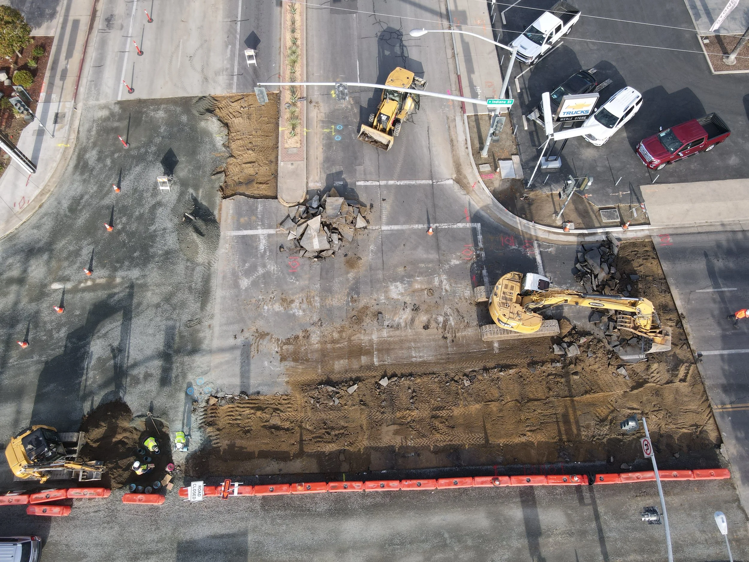Cal Valley Construction rebuilding a city intersection—excavators breaking out old asphalt, crews swapping curb, sidewalk, and median under traffic‑control cones as part of a multi‑year municipal rehab including full reconstructions and grind‑and‑overlay program with new pavement markings.